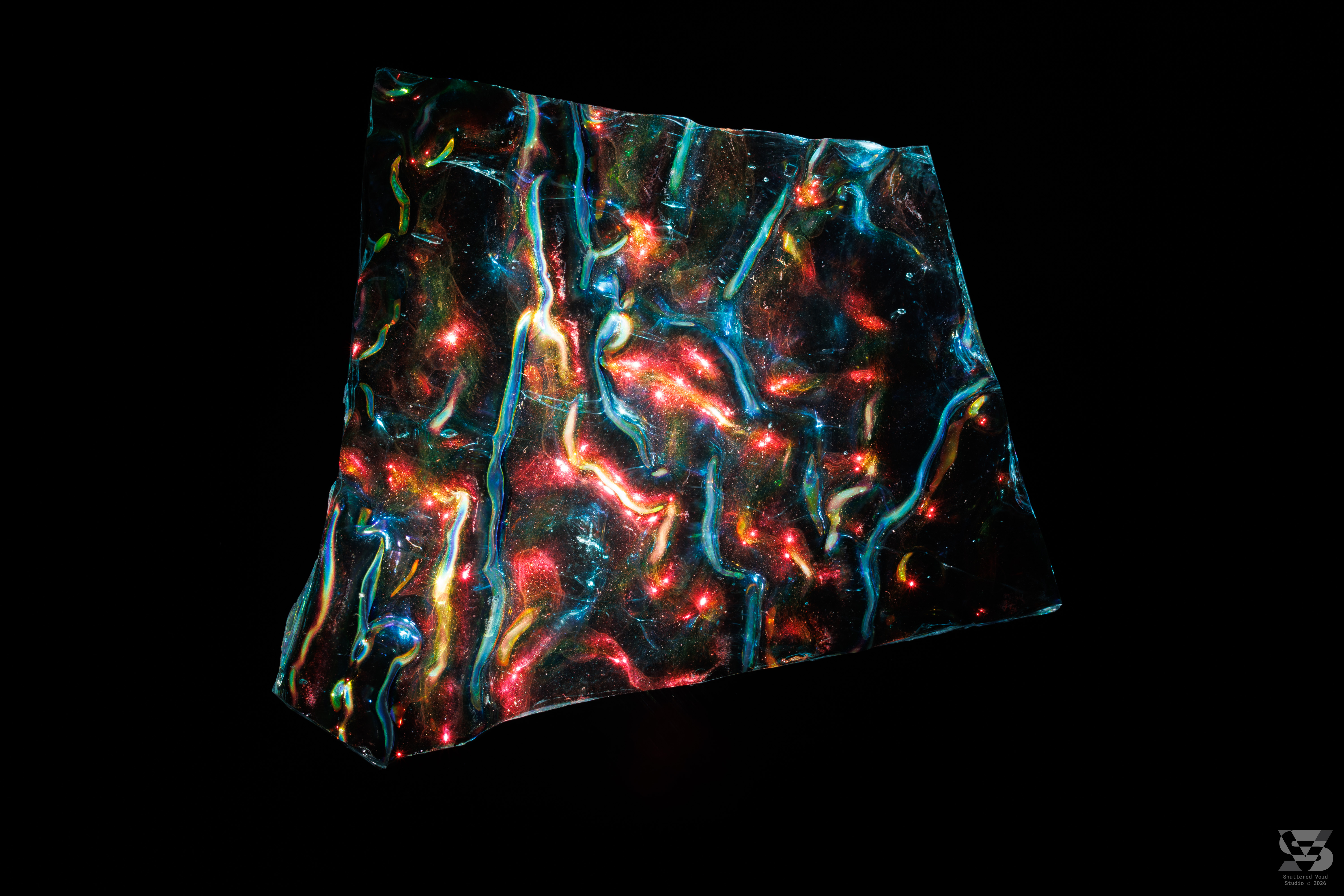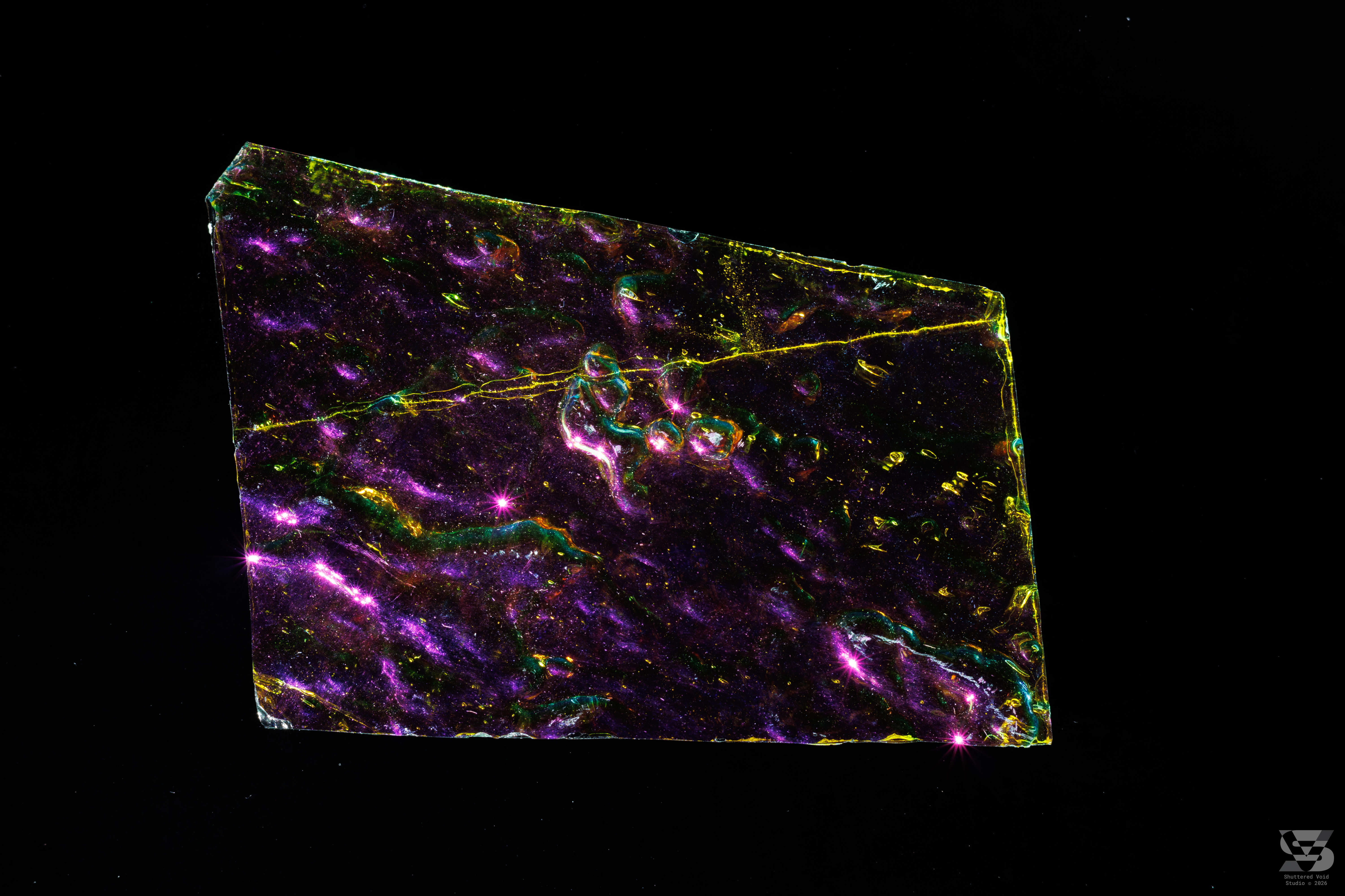 These are photographs of some wavy dichroic shards and refractive X-cubes that I was playing with on a dreary Saturday.